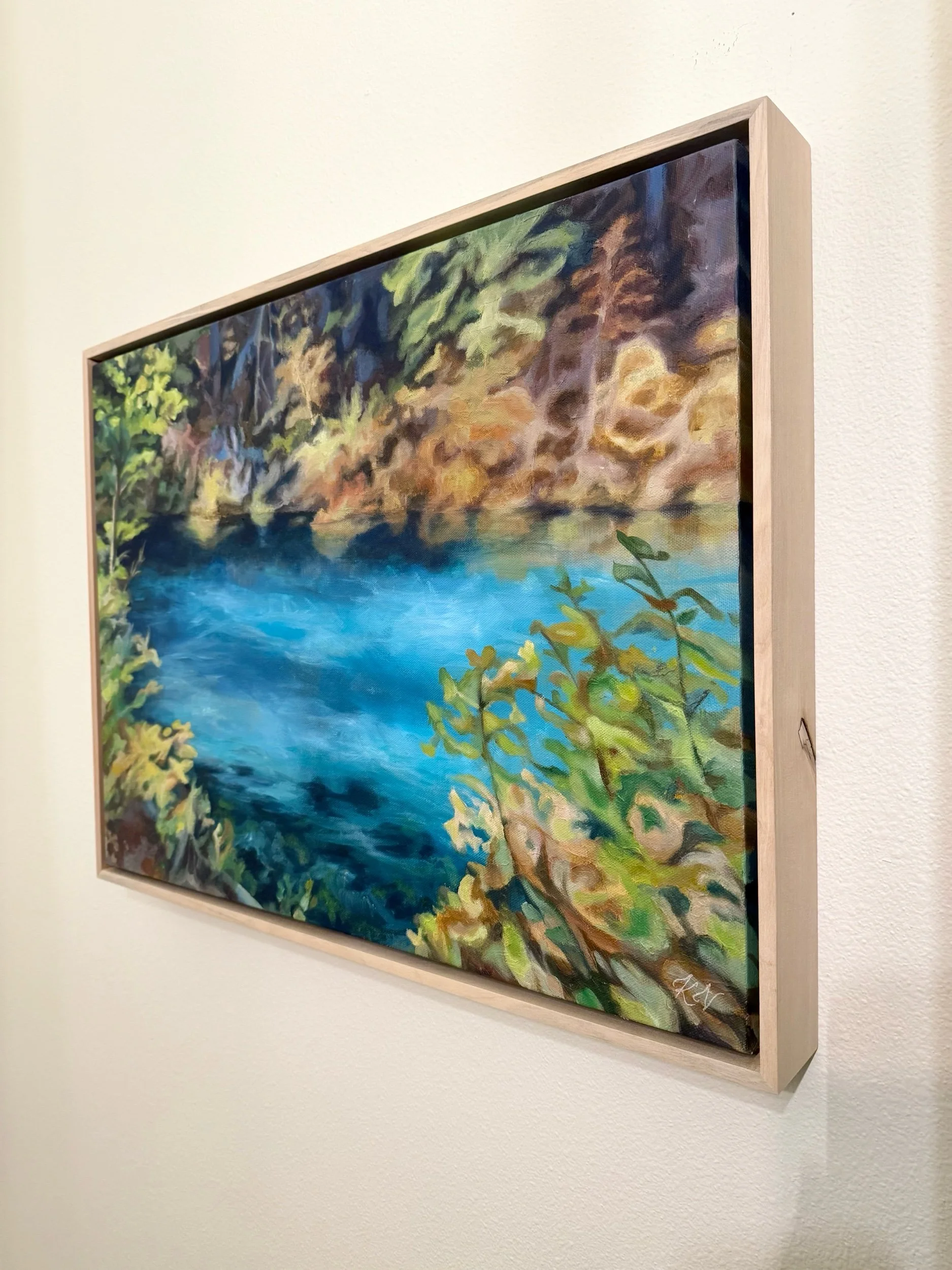 This piece was originally painted in October 2024. I used a reference photo from a family trip to the Metolius River and Camp Sherman area in October of 2021. At the time, I had a 9 month old, and we went for the smallest of hikes along the river. This portion of the river has less foot traffic, and shortly into the hike, the river bank opposite to the trail has a spring gushing from the side of the steep hill that juts up from the river basin. This particular day, the golden fall light was hitting the water so perfectly that the illumination created a gem-like effect in the crystal clear, glacier blue water. It looked just like a swirling, moving sapphire in the light. It is still one of the most beautiful moments I’ve experienced at this river, so I made this piece to capture and showcase the vibrant color, illumination, and fractals in the water.